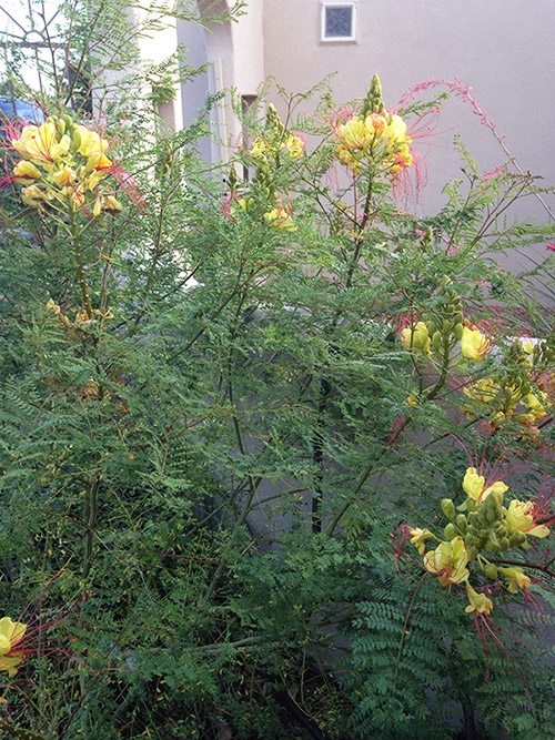 This is more commonly known as the bird of paradise but in the southwestern desert, it’s called the Desert Bird of Paradise. Not as showy as its cousin the Red Bird Of Paradise but hardier. Easy care and lower water. Water about 1-2 times per week when first planted. Then cut back to about once per week…even less during the cooler months.