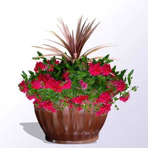Verbena is another great flowering plant that will bloom from mid-spring until late summer. It is a good choice because it can tolerate the hot summer sun, but it does like more water. Numerous colors to choose from…purple, red, and white verbena will spread and drape down on all pots.