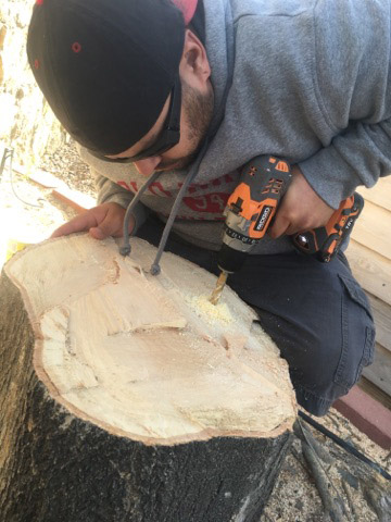 The more holes you make, the better. It is important to note that you should start drilling the holes ASAP; if you wait too long, the wood will get harder, especially with most pine trees.