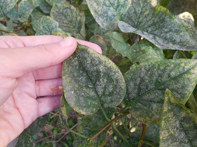 Powdery mildew first shows up on the youngest leaves and shoots but can jump to older leaves if I don’t act fast.