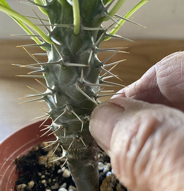 The Madagascar Palm Plant is NOT a true palm, it looks like one, but it isn’t. It is in the Apocynaceae dogbane family the Pachypodium genus. You can learn more about how it grows in its native habitat over at Wikipedia.com Its native habitat is of course south Madagascar and will grow up to twenty feet tall in its native land.