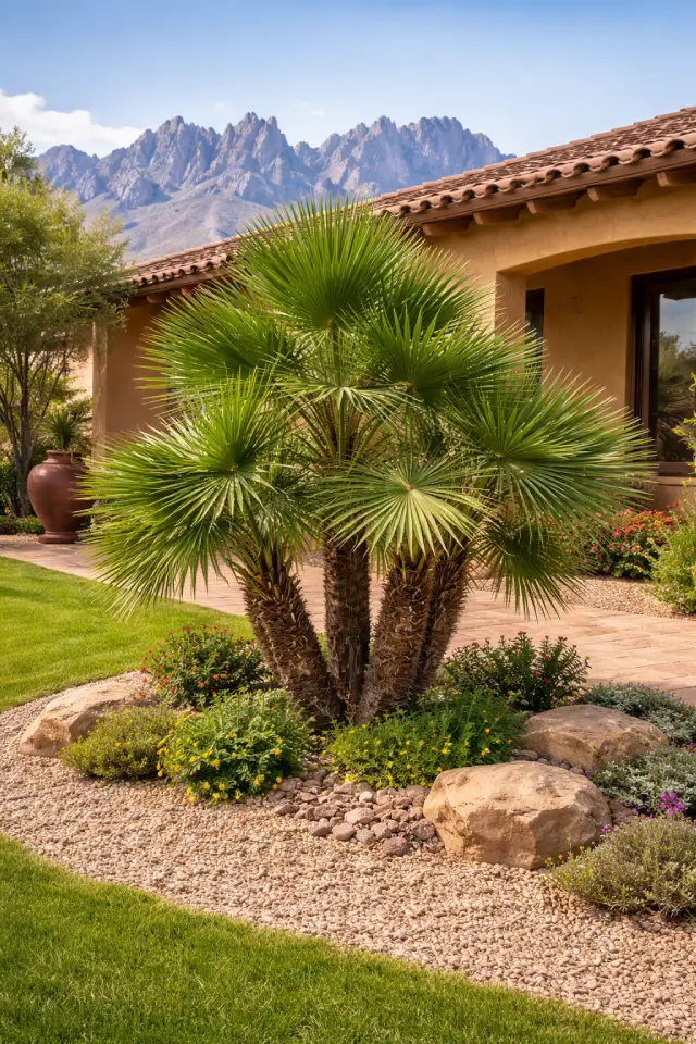 The palm naturally grows in a multi-trunked form, which gives it a full, layered appearance and adds strong visual interest. This growth habit makes it an excellent choice as a specimen plant, privacy screen, or accent in Mediterranean, Southwest, or desert-style landscapes. Its stiff, fan-shaped green leaves provide year-round texture and structure.