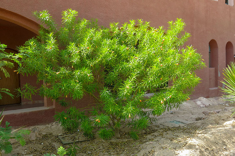 It is not a real Oleander, but a (Thevetia Peruviana) species also called the Lucky Nut Tree. The leaves are long and slender, much like the Oleanders. The flower is yellow and resembles the white, pink oleander flowers. They will grow up to 10 ft in height and sometimes taller. Truly little maintenance is involved, and they will do well throughout the American Southwest.