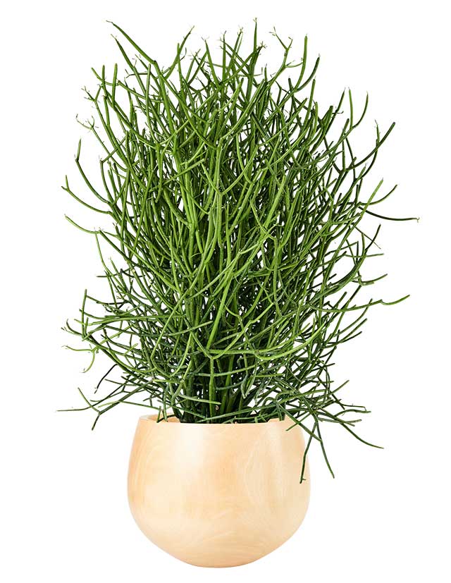 The Pencil Cactus gets its name from its slender, green stems that look like green pencils. These vibrant stems branch out in all directions, giving the plant an almost sculptural structure. When grown indoors, Pencil Cacti can reach impressive heights—up to six feet if given the right conditions! Its clean, modern look makes it an ideal choice for minimalist spaces or as a bold focal point near a bright window.