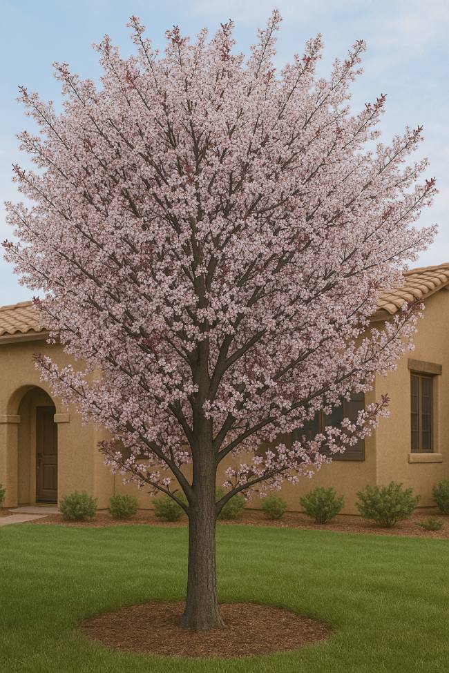 Purple Leaf Plum Trees (Prunus cerasifera) are small to medium-sized trees that do well in and around the southwest. The most interesting thing about these trees is the brilliant, showy, bright pink flowers they produce during the early spring. It is one of the first trees to bloom in early spring. Here is more information on Early Blooming Trees and Plants.