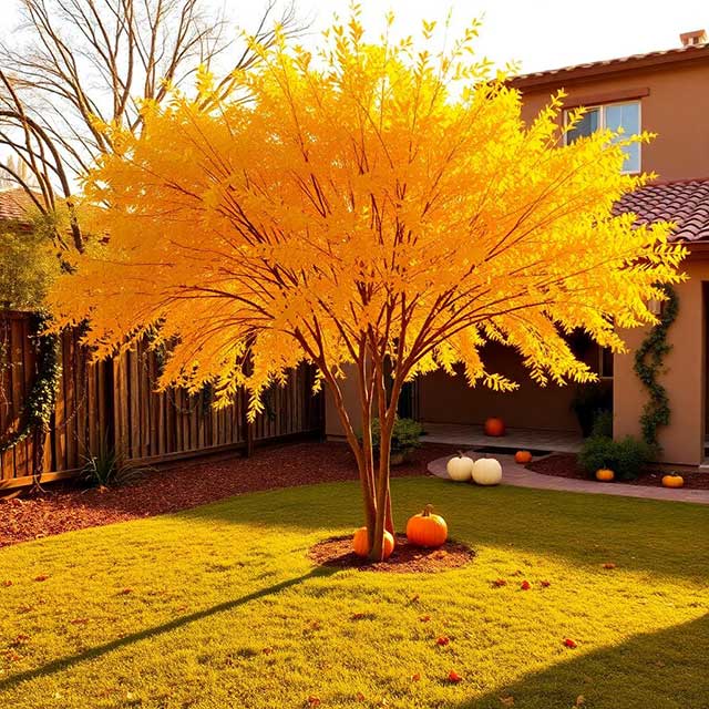 It is deciduous and will turn a goldish yellow in the fall. It is also one of the first trees to leaf out during early spring. The root system is invasive, and they are prone to insects. This shade tree is an excellent choice for many southwestern landscapes. Learn more here.