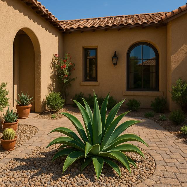 A very hardy Agave plant that has blue-green leaves with yellow and red margins from its fronds. Each frond or leaf has a sharp red-tipped spine…almost a needle-like tip. It will grow to about 1 1/2 ft. tall and about 2 ft. wide. Their blooms are showy yellow flowers in about their tenth year of growth. It does great in a rock garden or Xeriscape landscape, but it does like more water than other drought-tolerant plants. Especially during the hot mid-summer months. If possible, place it in the afternoon shade to protect it from the hot scorching Southwest sun.