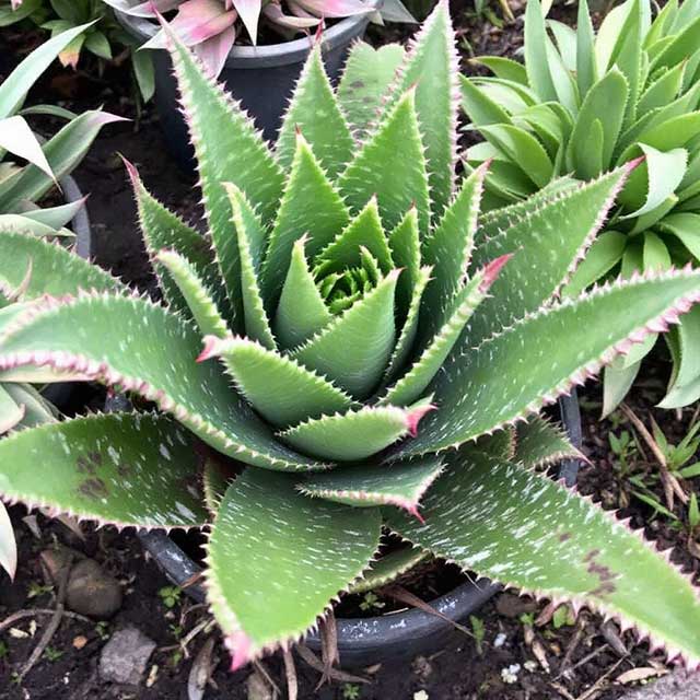 Spiral Aloe (Aloe Polyphylla) is succulent and will grow about 1 ft. tall and 2 ft. wide. It does not have a bloom or spikey plume. It is grown and used mainly for its colorful foliage. This plant is best used as an indoor house plant. It can be placed outdoors, but like most succulents, it will have a hard time with freezing temperatures and the hot scorching sun.