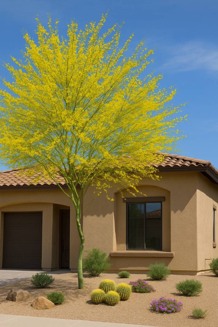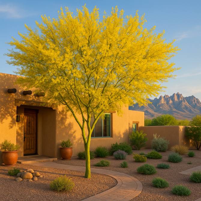 The Palo Verde tree (Cercidium-Parkinsonia) is also known as the Desert Museum Palo Verde. It is an exceptional tree for the Southwest. It is a Hybrid of the common Palo Verde tree that is native to the Sonoran and Southwest deserts. Palo Verde Means Green Stick in Spanish.