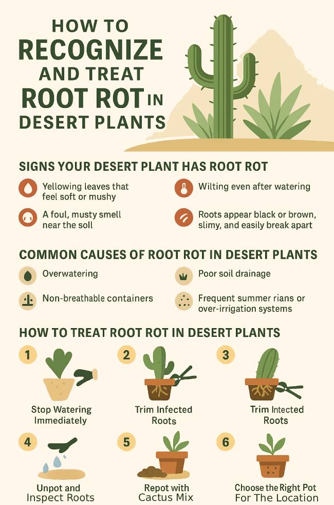 How to treat Root rot in desert plants. Root rot is a common problem—even in dry, arid climates like the American Southwest. While desert plants are drought-tolerant, they can still suffer from overwatering, poor drainage, or extended rainy spells. This guide will help you spot the signs early and take action to save your plants.