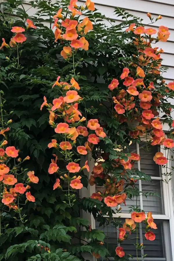 flowering vines in the United States. It grows quickly, climbs aggressively, and produces showy orange-red tubular flowers that attract hummingbirds from summer through fall. This trumpet vine thrives in full sun, heat, drought, and poor soils, making it ideal for fences, arbors, and chain-link barriers. Gardeners should provide strong support and prune yearly to keep it manageable. Campsis Radicans on Wikipedia.