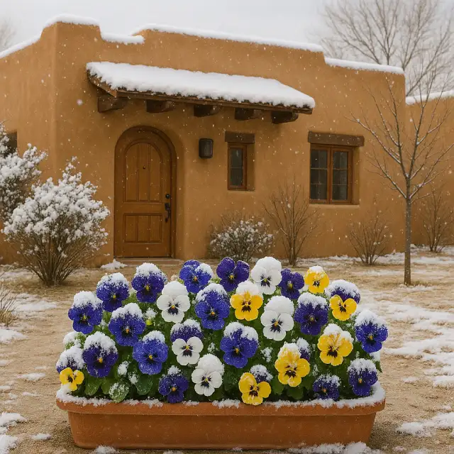 Pansies – Viola tricolor hortensis – Will take temperatures down to the mid-teens. They will wilt when it gets that cold but will spring back to life once the southwestern sun starts shining on them. Pansies are annuals meaning they will not come back after the winter seasons.